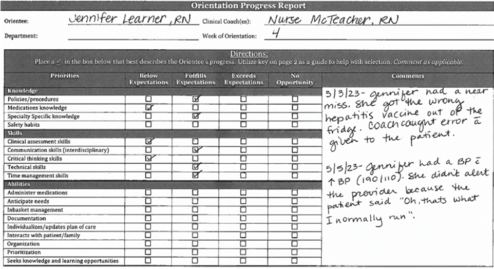 I'm pasting a sample that we use in our new leader orientation, showing how the document should be used. This also allows us the extra documentation to support the need for a longer orientation or if a move to a different specialty is indicated this document can help support that. The document uses the term "coach", which is a nod to the term clinical coach, which is what our organization calls preceptors.
